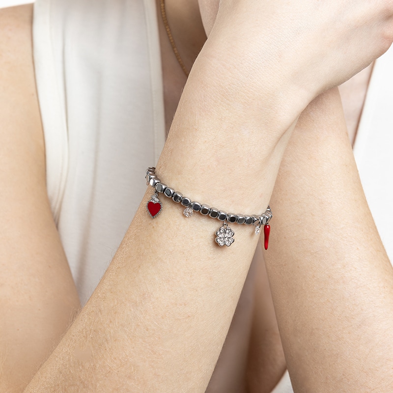 Das Würfelarmband mit emailliertem heiligen Herzen, vierblättrigem Kleeblatt mit Kristallen und rot emailliertem Horn als Glücksbringer #BrandGiojelli ist für diejenigen gedacht, die immer ein Symbol des Glücks tragen wollen. viel Glück ohne dabei auf Stil und Weiblichkeit zu verzichten. Dieses Armband ist das perfekte Schmuckstück für alle, die einen dezenten Farbakzent suchen, der sich an verschiedene Stile anpassen lässt.