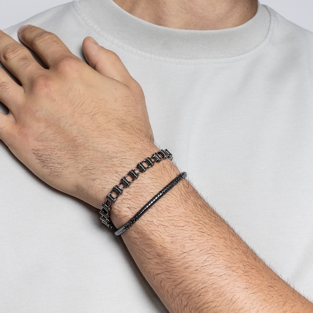 Das Hämatit-Schlangenarmband von #Brand Gioielli ist ein modernes und unverwechselbares Accessoire aus Edelstahl, verziert mit netzartigen Elementen, die an Schlangenleder erinnern. Das geradlinige, geometrische Design macht es perfekt für alle, die einen schlichten und dennoch raffinierten Stil lieben. Der tiefe Hämatitton sorgt für einen harmonischen und vielseitigen Look und passt ideal zu legeren wie auch eleganten Outfits. Dank des Karabinerverschlusses und der verstellbaren Kette bietet das Armband hohen Tragekomfort und ist besonders praktisch. Hergestellt aus langlebigen, hochwertigen Materialien, behält es seinen Glanz und seine Beständigkeit über lange Zeit.