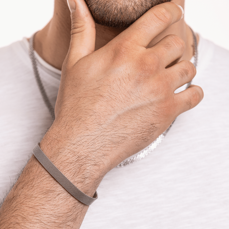 We use stainless steel, a hypoallergenic material that is resistant to oxidation, corrosion and water. Each product is accompanied by certificates of conformity certifying the purity of the steel and its safety for contact with the skin, in compliance with European regulations on nickel, lead and cadmium.