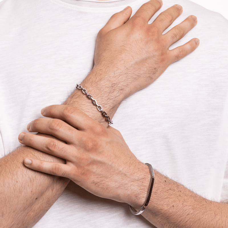 We use stainless steel, a hypoallergenic material that is resistant to oxidation, corrosion and water. Each product is accompanied by certificates of conformity certifying the purity of the steel and its safety for contact with the skin, in compliance with European regulations on nickel, lead and cadmium.