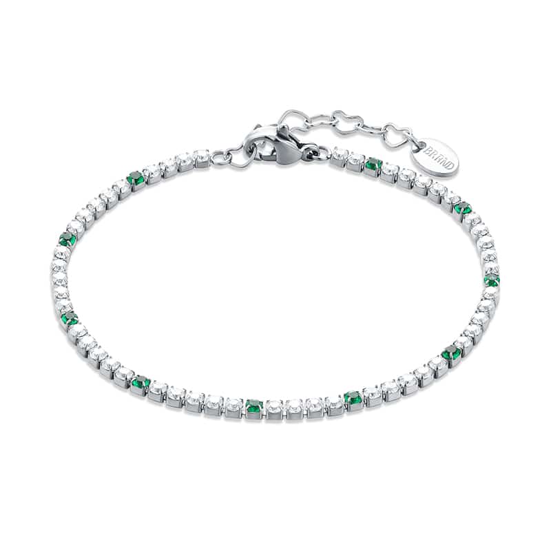 The classic colored-dot tennis bracelet for women by #Brand Gioielli stands out for its elegant and timeless design, featuring a refined sequence of harmoniously arranged luminous crystals. The classic tennis bracelet is reinterpreted in a contemporary way through a balanced rhythm that alternates white crystals with pops of color, creating a refined play of light and movement. The clean lines and shiny steel enhance a simple and sophisticated style, making this bracelet a versatile accessory, ideal for everyday wear or to complete more sophisticated looks with a bright and distinctive detail.