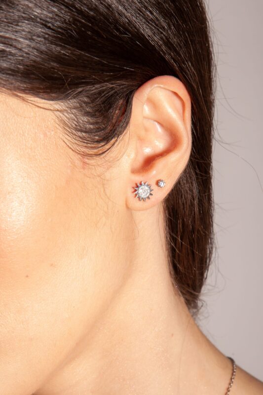 The crystal sun earrings by #Brand Gioielli stand out for their delicate and luminous design, featuring sparkling crystals. Their compact size makes them discreet and refined, ideal for everyday wear or as a second piercing, adding a touch of sparkle and romance to your look.