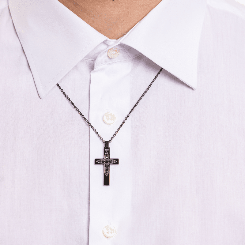 Collier croix couleur canon de fusil avec cristaux noirs