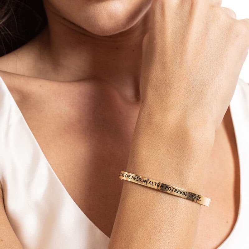Bracciale rigido PVD dorato in acciaio armonico con frase smaltata nera: