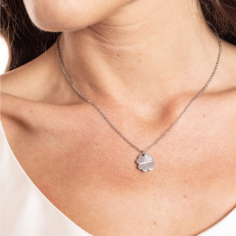 Collana Quadrifoglio Acciaio con Cristalli Bianchi