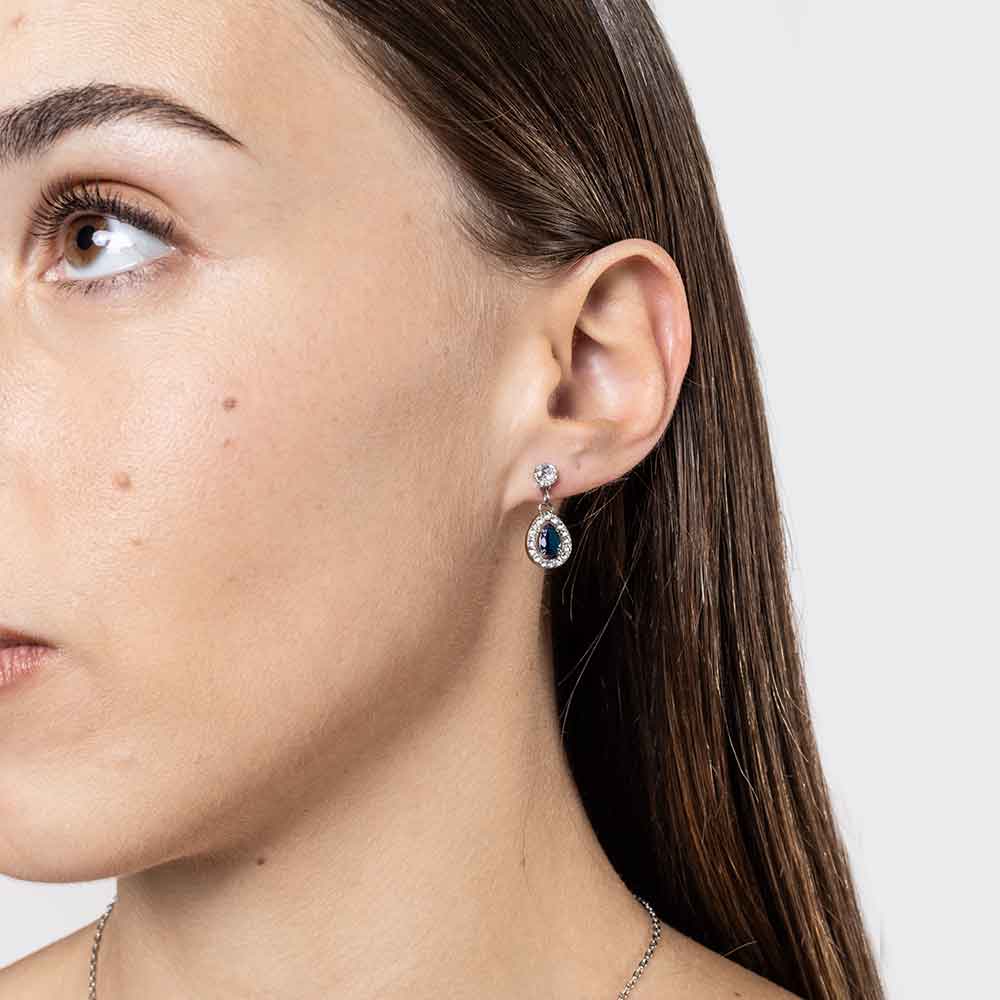 Orecchini punto luce bianco con cristallo goccia blu pendente